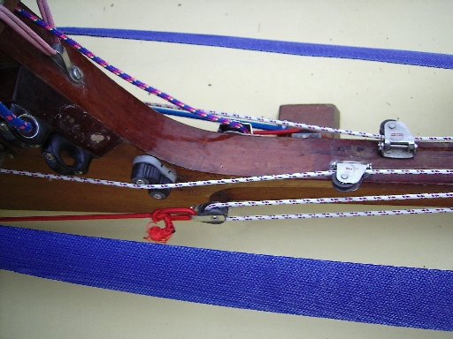 the damn time. So you need to be able to de-tension the red elastic when the kite is flying, which you do by uncleating a bit of rope.