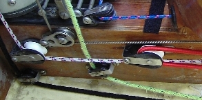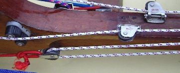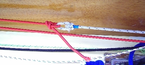 Comes back down inside the mast and pops out at the foot. Goes round a pulley. It's the white one. So far, big deal, but note the red elastic on the other