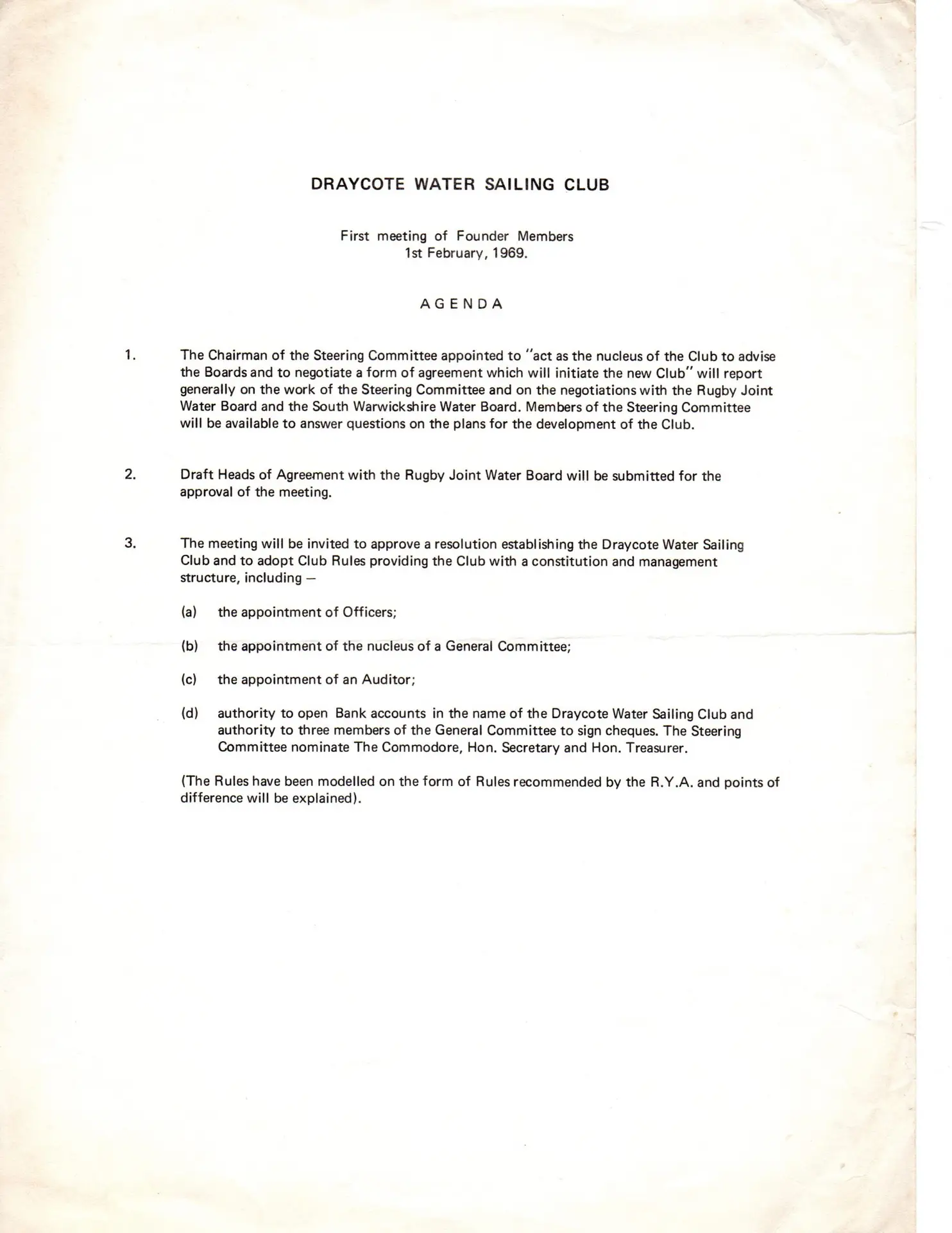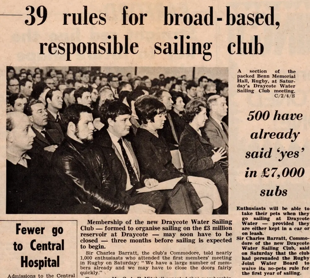 A small group of people led by Sir Charles Barratt had the vision of a sailing club on the reservoir and in 1968 called for a meeting of interested people by public notice in the local Press to be held in the Rugby Benn Memorial Hall. Bearing that there was little water in the reservoir at that time, the response was overwhelming which encouraged those founder members to approach Rugby Water Board and negotiate a lease which resulted in Draycote Water Sailing Club coming into being in 1969. The lease was conditional and the Club had to commit to a variety of works and site development to confirm the long term intent to base a sailing club on the site.