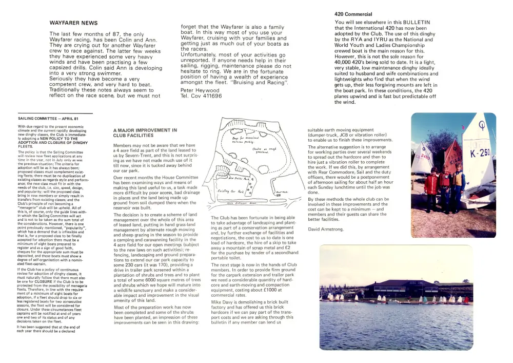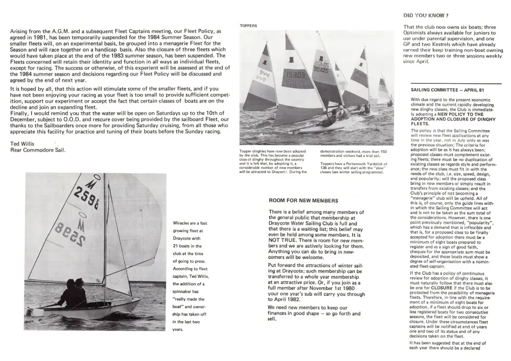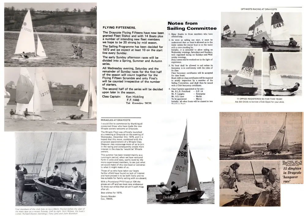 Sailing was initially based around a menagerie fleet which saw some strange craft at the club but over a short time popular classes emerged, the Club specified which classes of dinghy were preferred and the fleet concept and structure was born. This was the time of big fleets of popular dinghies, Mirror 10, GP14, Enterprise and Fireball all of which could be built from a kit by someone with average wood working ability. Such was the popularity of the Mirror 10 that numbers at the club were capped at 120. The backbone of the Clubs activities being racing these large fleets required an effective form of communication which was successfully achieved through the fleet Captains structure and a regular printed club magazine.