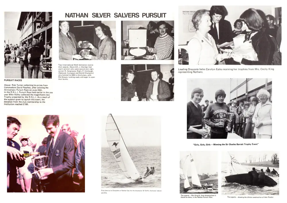 The Open meeting period was set during the months of September, October and November and was the era of the big Open Meetings with entrants regularly hitting the 80 mark in most classes. The Club also ran an invitation Open in March where all of the dinghy class associations were invited to send their top two crews and the DWSC fleets also entered their top two crews. This was the Silver Salvers event sponsored by Nathan the Jewellers of Birmingham. The winning boat receiving Rolex Oyster watches.
