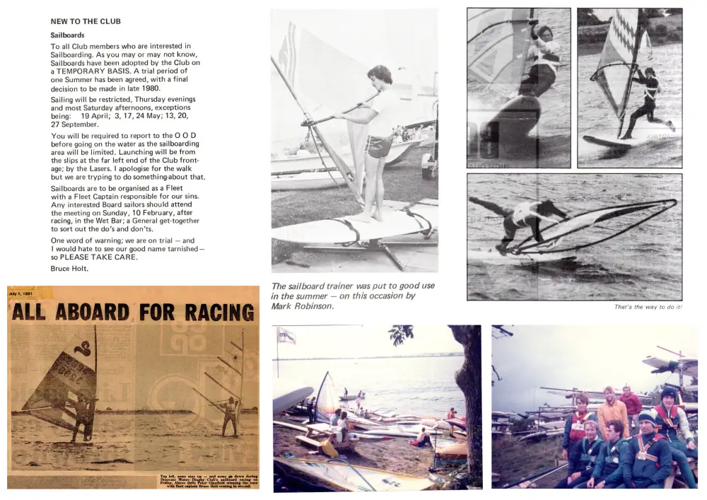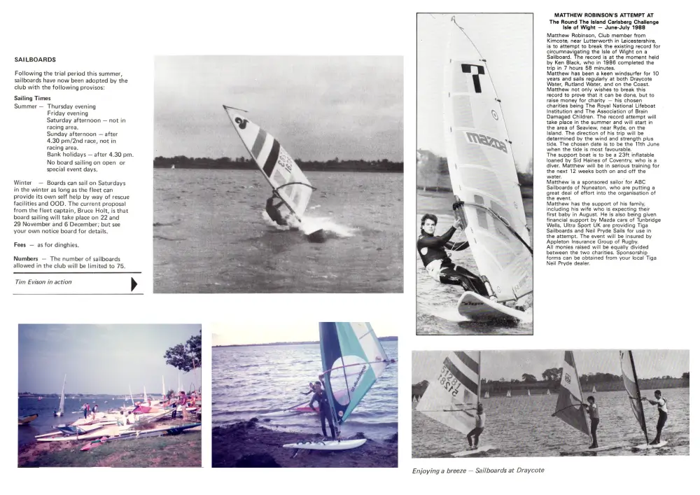 From 1984 the character of sailing changed with the introduction of windsurfing. Initially membership was opened to 30 windsurfing members for a trial period of a year in order to examine the new form of sailing. The first year was deemed to be a success and the limit was removed. The growth in windsurfing, their desire to use the club any day it was windy and some dinghy members wishing to cruise on a weekday brought about the 7 day a week opening of the club.