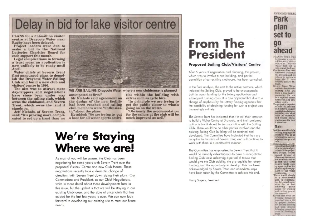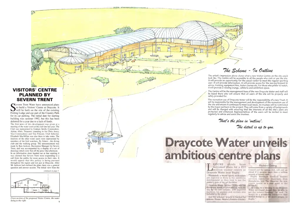 During the discussions STW proposed that the Club join with the Authority, to form a Draycote Water Trust, of which the Club would play a major part and manage the site activities, and the Club would be granted a new 28 year lease. Two years later in 1998 building plans were finalized and in 1999 the grant application was submitted. However, the Lottery Grant application failed due to STWs commercial interest and the scheme was abandoned. This was the beginning of a long period of increasing numbers of the visiting public, STWs desire to build a visitor centre and the Clubs desire to protect its interests and achieve a new lease.