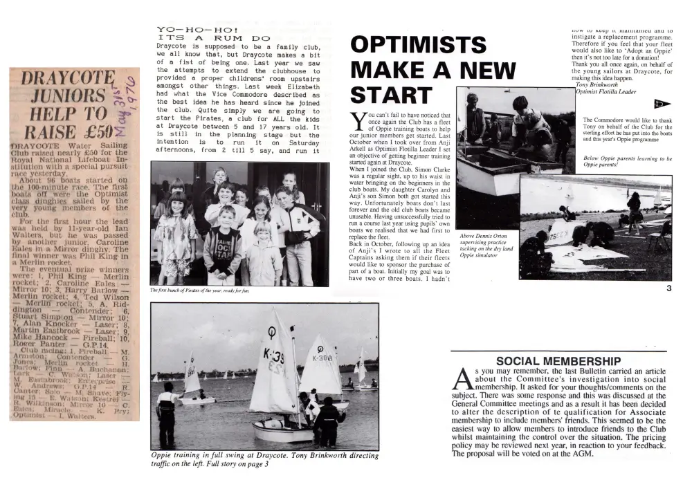 Training became an important feature of the club during this period. It was organized and run wholly by part time enthusiasts who not only were qualified instructors but also very capable handymen doing any and all necessary repairs. The Club eventually became an RYA Recognised Teaching Establishment which grew from dinghy sailing to encompass windsurfing and power boat instruction. Such was the success of the training reputation of the Club that each year there was an Optimist summer camp held for a concentrated course of training.