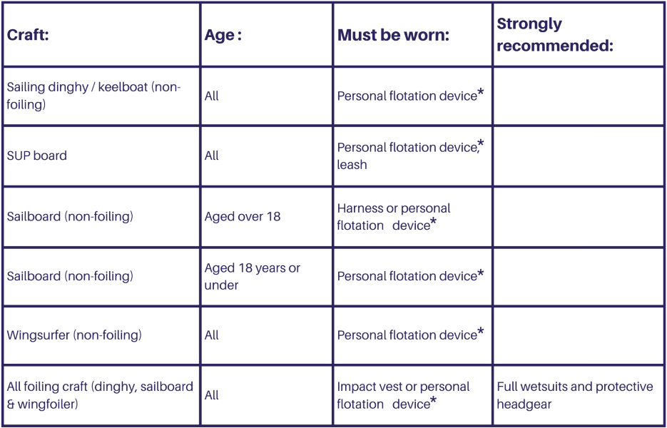 New RYA guidance has been issued to give clarification of the safety gear that needs to be worn on different boats / boards, and for wingsurfing and foiling craft, which is summed up in this table.