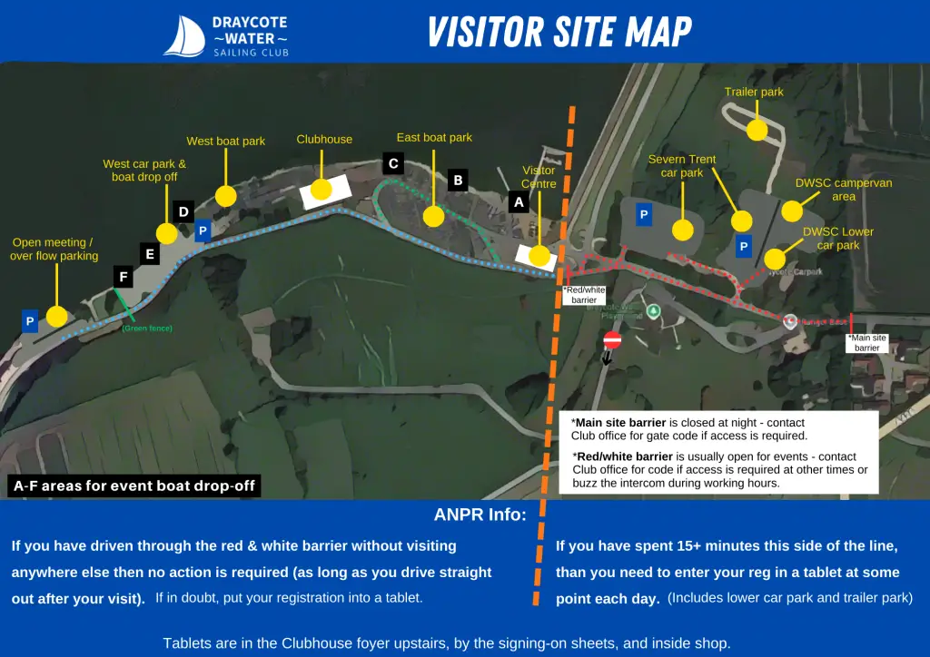 The site is now monitored by ANPR cameras but Sailing Club members and guests are exempt by following the procedure below. (See the map above for details of the areas mentioned):